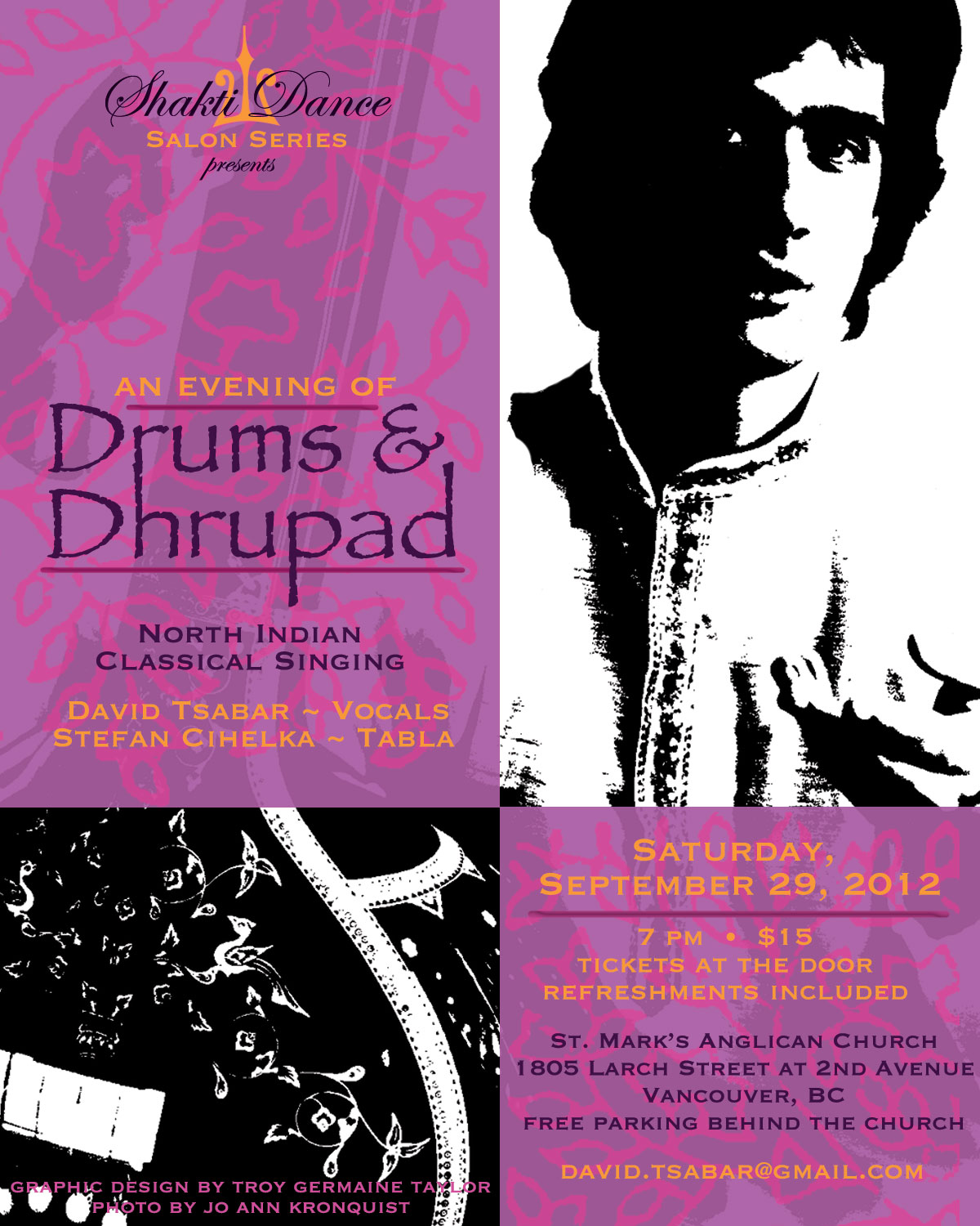 September 29th - AN EVENING OF DHRUPAD AND DRUMS. Featuring: David Tsabar and Stefan Cihelka. Shakti Dance is pleased to present these very talented artists performing North Indian Classical Vocals. 7:00 pm, Saturday, September 29th at St Mark's Anglican Church, 1805 Larch Street (2nd and Larch). Click here to download the poster.